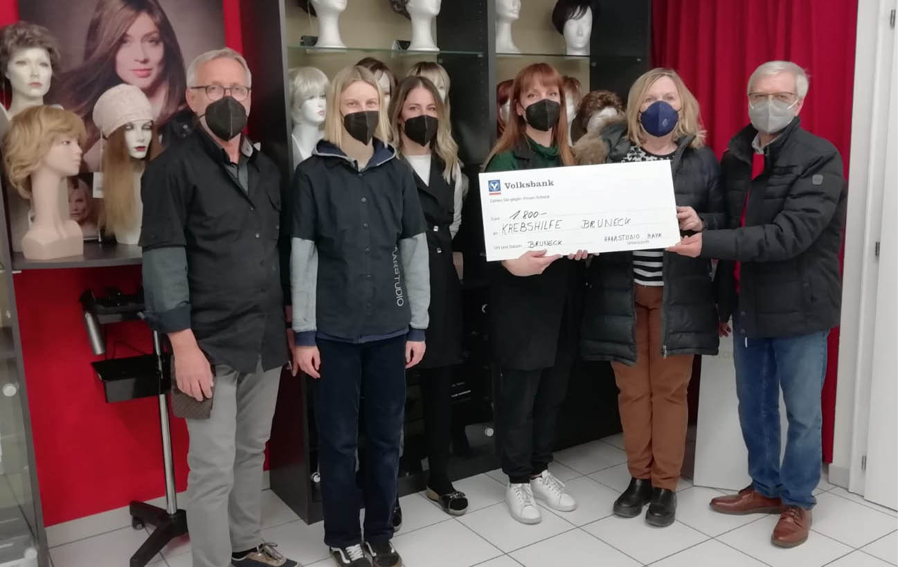 Miriam Mayr vom Haarstudio Mayr in Bruneck liefert die Haarspenden nach Deutschland an den Perückenhersteller Dening Hair Hamburg. Sie übergab der Südtiroler Krebshilfe im vergangenen März einen Scheck von 1.800 Euro für den Perückenfonds.