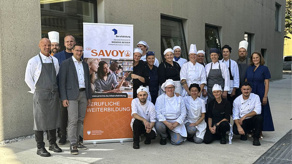 Startschuss für den Lehrgang zur beruflichen Qualifikation für Bedienstete im Küchenbereich über den zweiten Bildungsweg. v.l.n.r. vorne bis zum Banner: KM Hannes Hofer, Koordinator Emil Oberprantacher, hinten bis zum Banner: KM Markus Malfer, Direktor Karl Telser, außen rechts neben den TeilnehmerInnen KM Markus Steger, und Koordinatorin Claudia Pedoth – ...