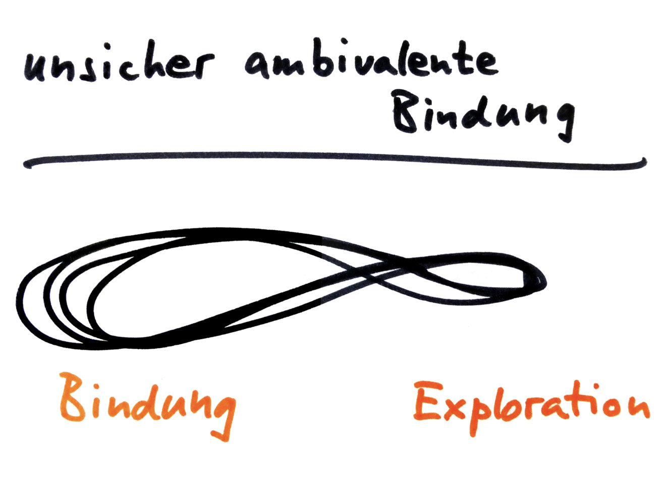 Das folgende Schaubild zeigt in der liegenden unsymmetrischen Acht die Verteilung der seelischen Energie bei der unsicher-ambivalenten Bindungsform. Bindung, Bindungssuche, dazwischen Abstürze, weil die Bindung nicht zufriedenstellend gelang, wechseln sich ab. Für das Explorieren bleibt fast keine Energie. Beziehungen stehen permanent im Mittelpunkt, alles dreht sich um Beziehungen, meist um Beziehungen, welche nicht so recht befriedigen, dafür aber vermehrten Gesprächsstoff liefern können.
