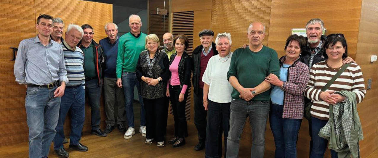 v.l.n.r. Georg Kröss, Gottfried Maschler, Sepp Raifer, Heinrich Ungerer, Willi Franzelin, Kellermeister Willi Stürz, Inge Kaiser, Helmuth Kaiser, Christine Franzelin, Paul Tröbinger, Henriette Oberhauser, Hans Oberhauser, Anni Perkmann, Karl Hilpold und Doris Amort. – FOTO: Erich Amort