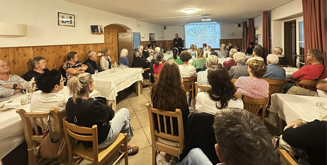 Der Vortragssaal in Frangart war bis auf den letzten Platz gefüllt, als Christian Wenter anlässlich des Welt-Alzheimertages auf Einladung der Ortsgruppe und des Kulturausschusses über Ursachen, Vorbeugung und neue Behandlungsmöglichkeiten sprach. Ein herzlicher Dank an alle Besucherinnen und Besucher – und an Dr. Wenter für die verständlichen und berührenden Einblicke in ein Thema, das viele betrifft.