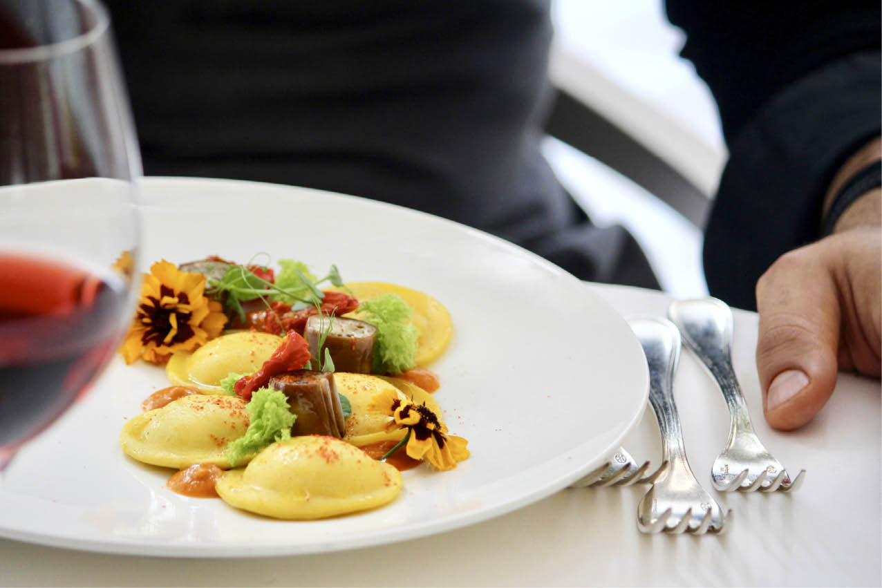Ravioli | Burrata-Tomatenfüllung | Baby-Melanzana | Basilikumschwamm – FOTO: Meraner Hof