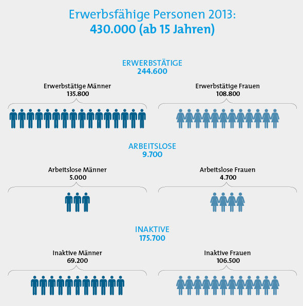 Es fällt auf, dass mehr Männer als Frauen erwerbstätig sind. Frauen sind häufiger von Arbeitslosigkeit betroffen. Unter den „Inaktiven“, d.h. der erwerbsfähigen, aber nicht erwerbstätigen und nicht arbeitssuchenden Bevölkerung ab 15 Jahren sind viele Jugendliche in Ausbildung, Hausfrauen und Hausmänner, arbeitsunfähige Personen und RentnerInnen. Von diesen insgesamt 175.700 inaktiven Personen sind 46% im Ruhestand. Die zweitgrößte Gruppe bilden die Hausfrauen (22%) und die SchülerInnen und StudentInnen (22%). Darauf folgen die Arbeitsunfähigen und Personen in einer anderen Nichterwerbsstellung (9%).