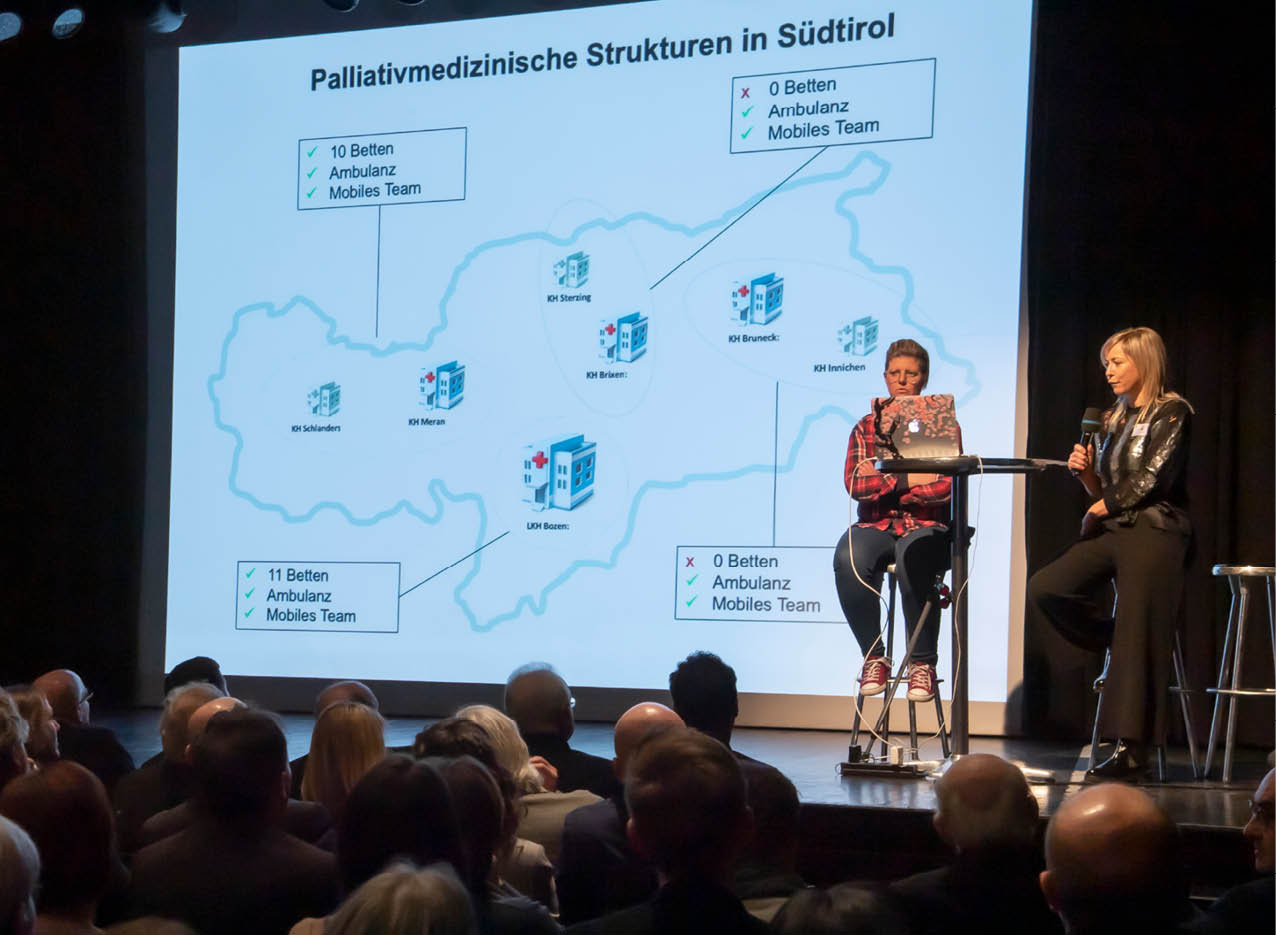 Palliativbehandlung ist ein Menschenrecht und seit 2010 auch per Gesetzesdekret verankert. Mit Sterbehilfe hat das nichts zu tun und auch nicht unbedingt mit dem Sterben. Palliativbehandlung sollte bei der Diagnose einsetzen. Sigrid Mayr und Anja Oberstaller gaben einen Überblick über die Palliativversorgung im Sprengel Bruneck. Ziel ist die Verbesserung der Lebensqualität von Patienten und Angehörigen. In Südtirol gibt es derzeit 21 stationäre Betten, zehn in Meran und elf in Bozen; fünf weitere sind in Bruneck geplant; das Projekt wurde durch den Tod von Dr. Brugger vorläufig gebremst. Hinzu kommen ambulante und mobile Palliativteams für die Versorgung zuhause. In Bozen hat Dr. Massimo Bernardo die Palliativtabteilung und das Hospiz aufgebaut; in Brixen gibt es seit 2019 einen Palliativmediziner, Dr. Thomas Völkl.Seit 1. Januar 2020 werden die drei ambulanten Krankenpfleger in Bruneck von Dr. Giovanni Brescia unterstützt, der auf viele Jahre Intensivmedizin zurückblicken kann. „Wir sind die Brücke zwischen Krankenhaus, Sprengel und Hausarzt.“ Die Palliativbehandlung ist die Fortsetzung der bestmöglichen Therapie unter anderen Voraussetzungen. „Unabhängig vom Zeitfaktor geht es vor allem um die Lebensqualität und um Vermeidung unnötiger, invasiver Behandlungen,“ unterstrich Dr. Brescia. „Palliativmedizin ist vor allem ein Netzwerk und kann dann am besten funktionieren, wenn jeder Arzt einen palliativmedizinischen Ansatz hat“, betonte der Onkologe Dr. Christoph Leitner. „Je früher die palliativmedizinische Behandlung parallel zur Therapie einsetzt, desto besser für den Patienten.“