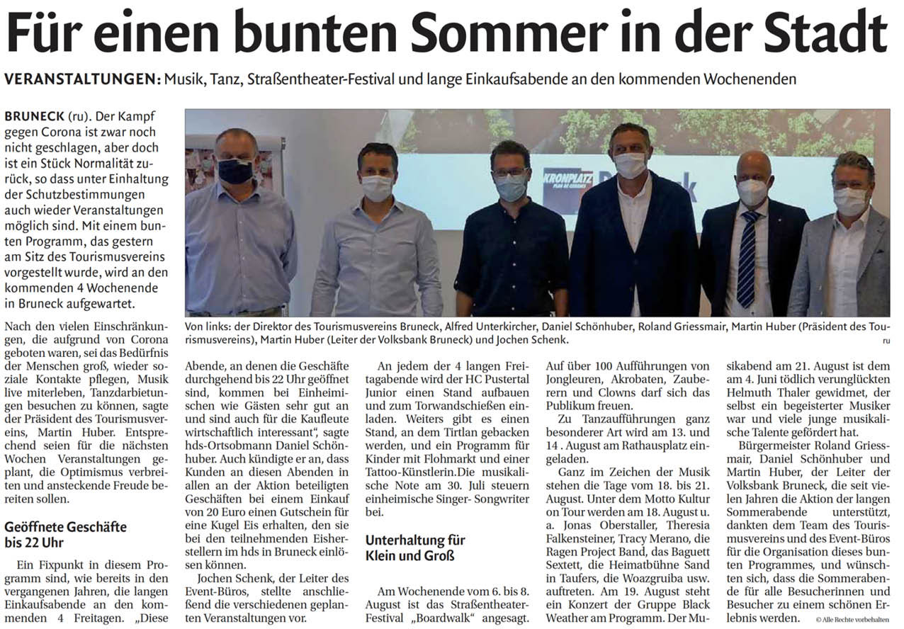 Le serate di shopping serale dovevano “colorare” il nucleo storico di Brunico. A fornirci il mansplaining al riguardo sono cinque esperti sul quotidiano “Dolomiten” del 27 luglio.