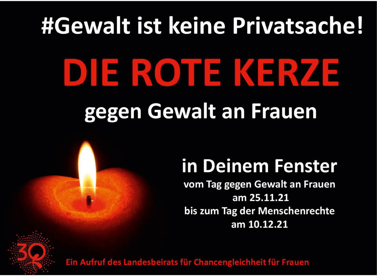 Unter dem Motto #gewaltistkeineprivatsache steht die Aktion „Die Rote Kerze“. Als Zeichen der Verbundenheit mit jenen Frauen, die von Gewalt betroffen sind, kann eine rote Kerze ins Fenster oder auf den Balkon gestellt werden. Die Aktion beginnt am 25. November und läuft bis zum Tag der Menschenrechte am 10. Dezember.