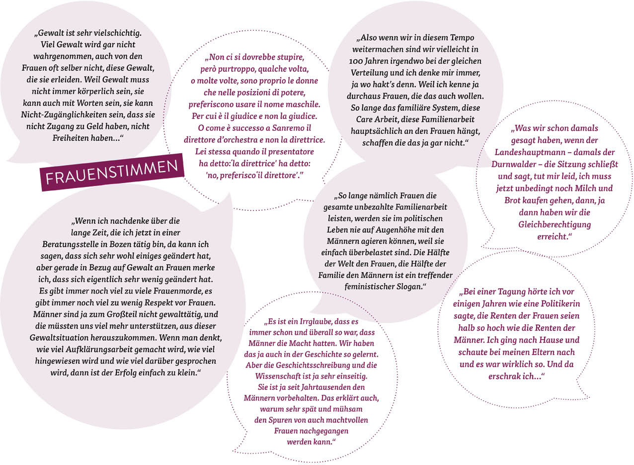 Dass etwas passieren muss, sieht auch der zuständige Landeshauptmann Arno Kompatscher, für den jeder Tag ein Tag der Frau, der Fairness, der Gerechtigkeit und der Chancengleichheit sein solle: „Wir müssen vom Reden ins Handeln kommen", betonte Kompatscher und stellte klar: „Es ist ein gesellschaftlicher Fortschritt, wenn wir das gemeinsame Bewusstsein für mehr Gerechtigkeit stärken, Lösungen erarbeiten und Dinge verändern." Die Video- und Toninstallation „Die Stimme erheben – Alzare la voce“ soll ein Ansporn dafür sein und steht als 30-minütiger Film oder auch in seinen Einzelteilen zu den Themen Gewalt an Frauen, Gleichberechtigung, Lohnschere, Frauen in Führungspositionen und Bild der Frau in der Gesellschaft für öffentliche Veranstaltungen, für Unterrichtseinheiten und viele andere Gelegenheiten mehr kostenlos zur Verfügung unter