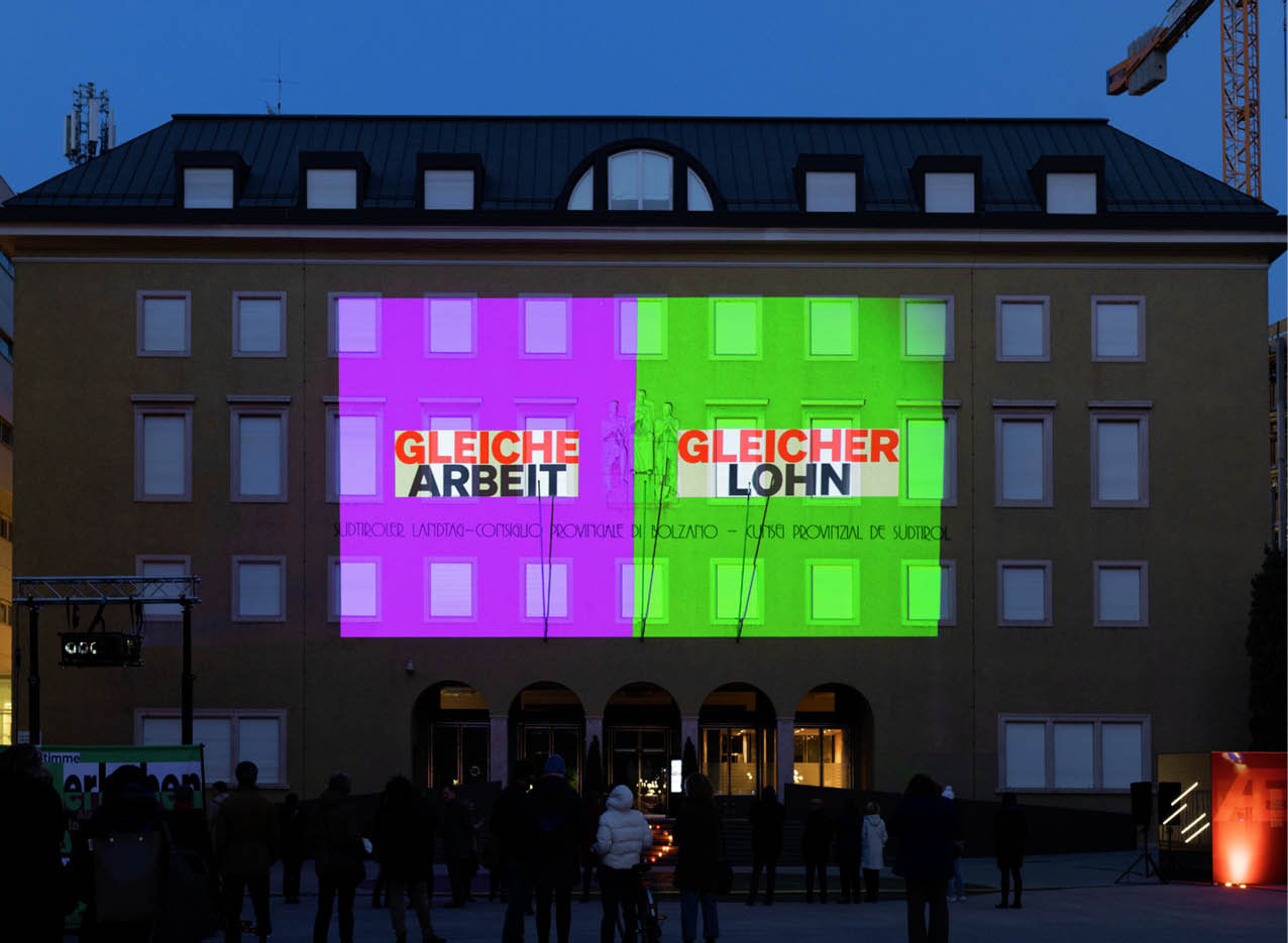 Ziel der Ton- und Videoinstallation ist es, die dringendsten Frauenanliegen und ungerechtfertigten Ungleichheiten neu sichtbar zu machen. Zum Tag der Frau hat dies der Landesbeirat für Chancengleichheit auf dem Silvius-Magnago-Platz in Bozen getan, aber auch noch 25 weitere Gemeinden und Organisationen haben die einprägsamen Bilder und die ausdrucksstarken Statements gezeigt, darunter die Freie Universität Bozen und die Wirtschaftsfachoberschule Meran, die aus dieser Aktion sogar eine Unterrichtseinheit machen möchte. „Frauen sind systemrelevant, aber agieren leider immer noch überwiegend im Hintergrund und sind damit nicht sichtbar. Wir wollen dies ändern, am Frauentag und an jedem anderen Tag im Jahr“, betonte die Präsidentin des Landesbeirates für Chancengleichheit Ulrike Oberhammer bei der Vorstellung der Aktion.