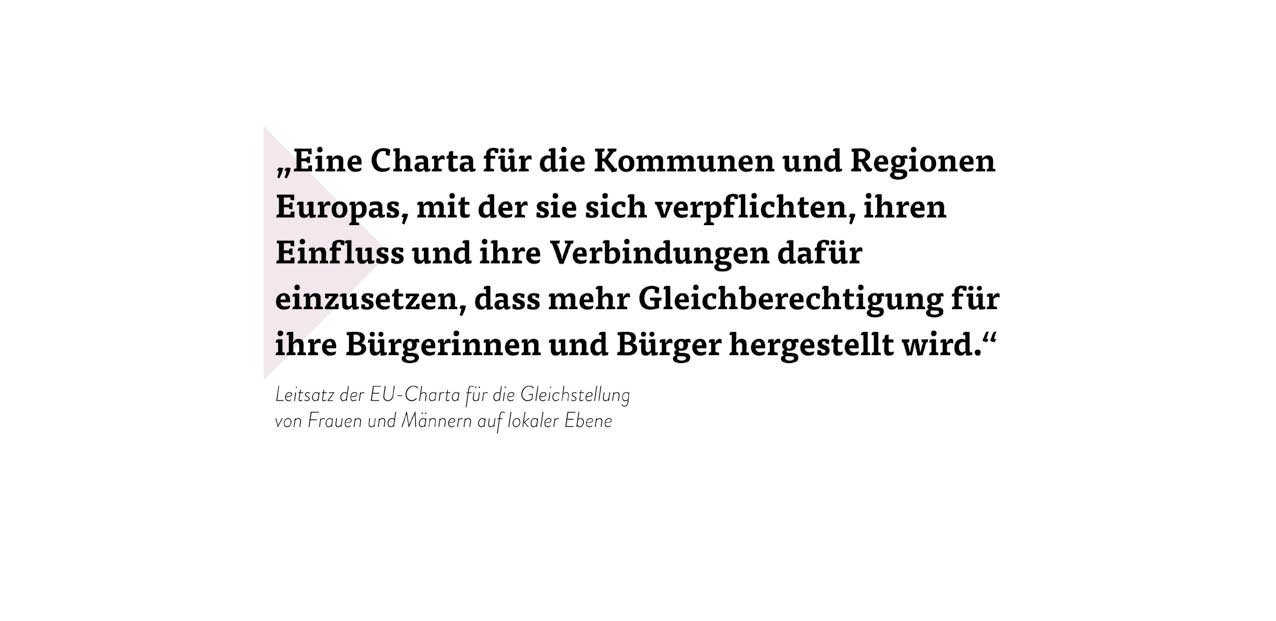 Die Europäische Charta für die Gleichstellung von Frauen und Männern auf lokaler Ebene wurde vom Europäischen Rat der Gemeinden in Zusammenarbeit mit verschiedenen europäischen Institutionen bereits im Jahr 2006 erarbeitet. Der Rat wendet sich an die Lokal- und Regionalregierungen Europas und lädt sie ein, die Charta zu unterzeichnen, sich formell und öffentlich zum Grundsatz der Gleichstellung von Frauen und Männern zu bekennen und die in der Charta niedergelegten Verpflichtungen innerhalb ihres Gebiets umzusetzen.
