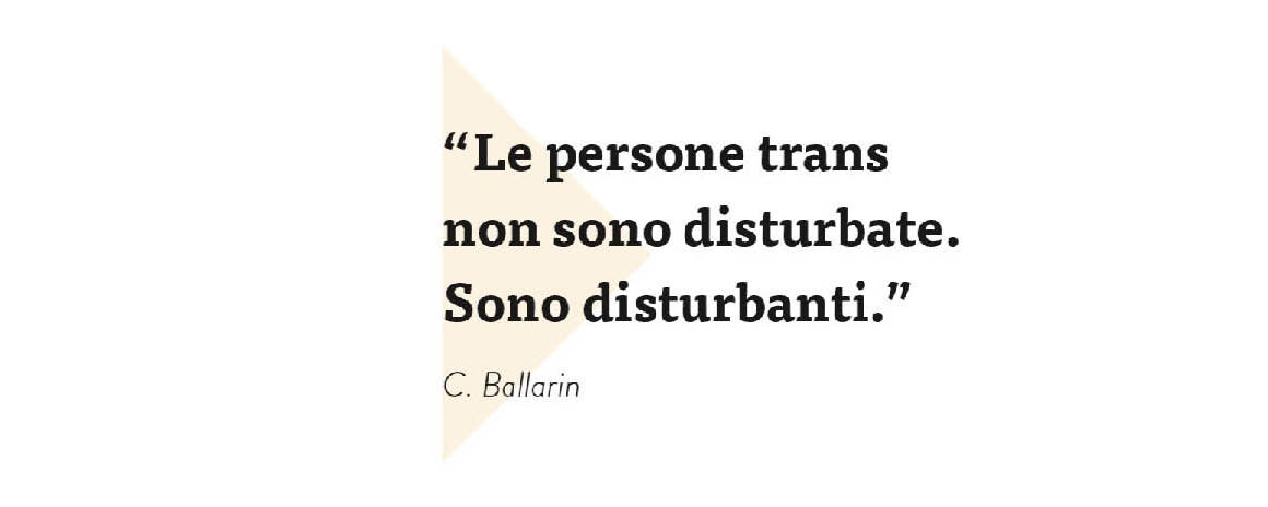 Ritengo ci sia bisogno di una rivoluzione culturale che non riguarda solamente l’identità di genere delle persone transgender ma l’identità di genere di tuttə e la società in generale. È necessario cambiare paradigma e capire che il problema non è della persona ma di un contesto che quella persona non la prevede. Non è la persona non conforme a doversi adeguare non sono i genitori a dovere "accordare" il figlio o la figlia per proteggerli, ma sono gli altri che devono imparare a conoscere, capire e accogliere.