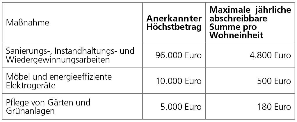 Für die Sanierungs-, Instandhaltungs- und Wiedergewinnungsarbeiten an Wohnungen und Wohngebäuden, sowie den Ankauf bereits sanierter Wohngebäude und den Ankauf von Möbeln und energieeffizienten Elektrogeräten im Zuge der Sanierung und der Pflege von Gärten und Grünanlagen bestehender Gebäude, kann ein Steuerabzug in Anspruch genommen werden.