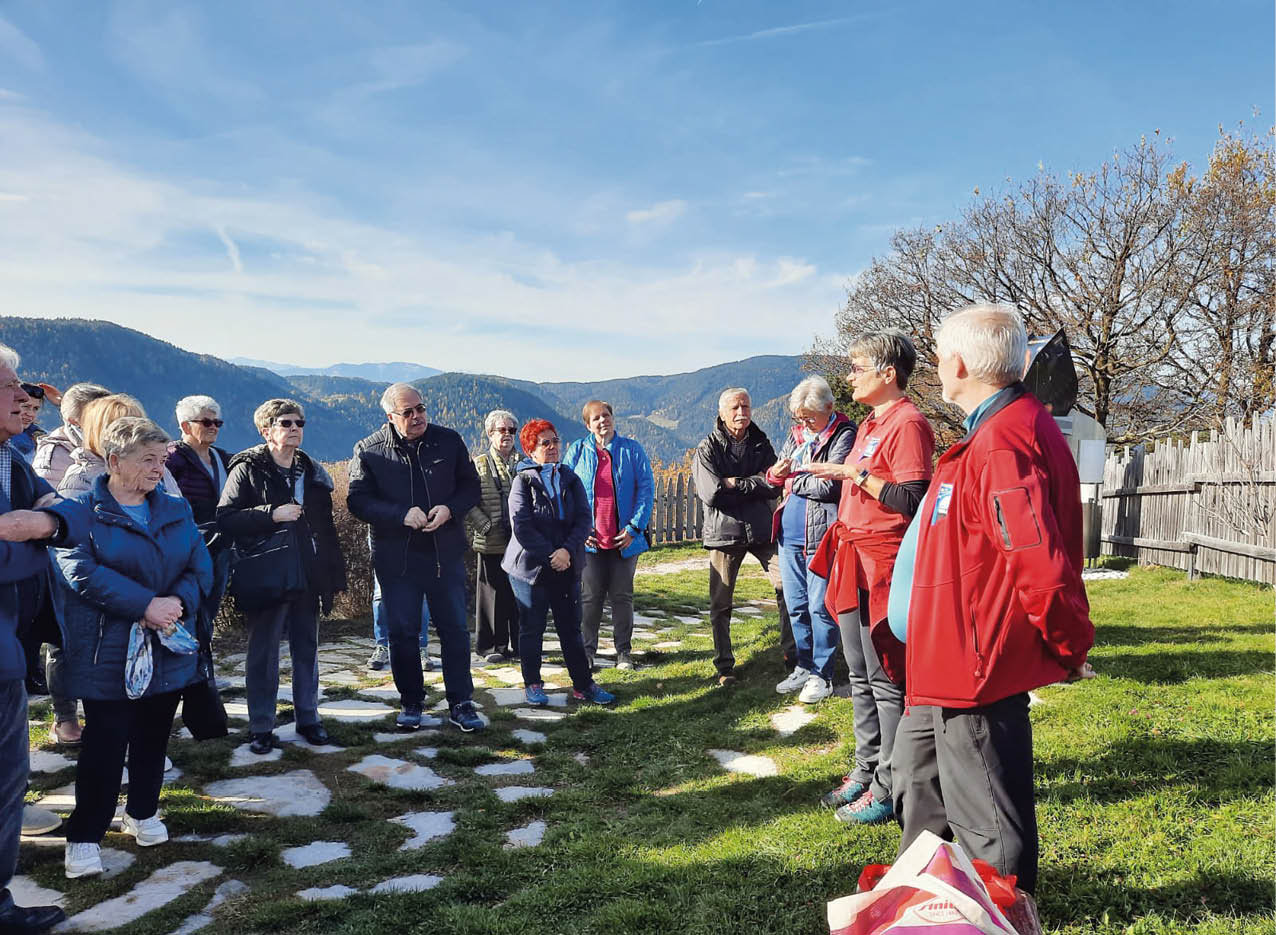 Anschließend kehrten wir im nahe gelegenen Gasthof Unteregger zum Törggelen ein. In geselliger Runde wurde gelacht und geplaudert, auch ein Karterle durfte nicht fehlen. Umrahmt wurde das gemütliche Beisammensein von Karl auf der Ziehamonika mit flotten Weisen. Die Wanderfreunde nutzten das schöne Wetter für eine kleine Runde auf dem Planetenweg.