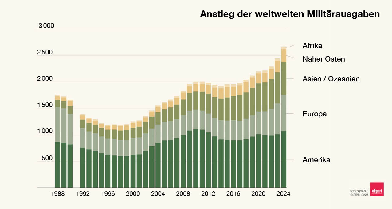 Die weltweiten Militärausgaben steigen rasant, das zehnte Jahr in Folge. – QUELLE: SIPRI Database April 2025